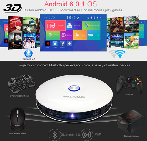 BYINTEK UFO R11 портативный светодиодный Smart видеопроектор 3LED DLP предназначен для создания домашнего кинозала, во время презентации или деловых встреч в офисе, а так же для просмотра фильмов и игр во время путешествия на природе. BYINTEK UFO R11 имеет встроенный литиевый аккумулятор. Есть поддержка 4К онлайн кино/поддержка 4К с usb флеш-накопителя, конвертация 2D в 3D, ОС Android, разрешение 1280:720/1080P, Яркость: 350ANSI lumens, контрактность 10 000:1, Срок службы лампы - 30 000 часов, поддержка AirPlay, miracast, беспроводное соединение WiFi, Bluetooth, пульт- манипулятор(гироскоп), встроенные динамики.